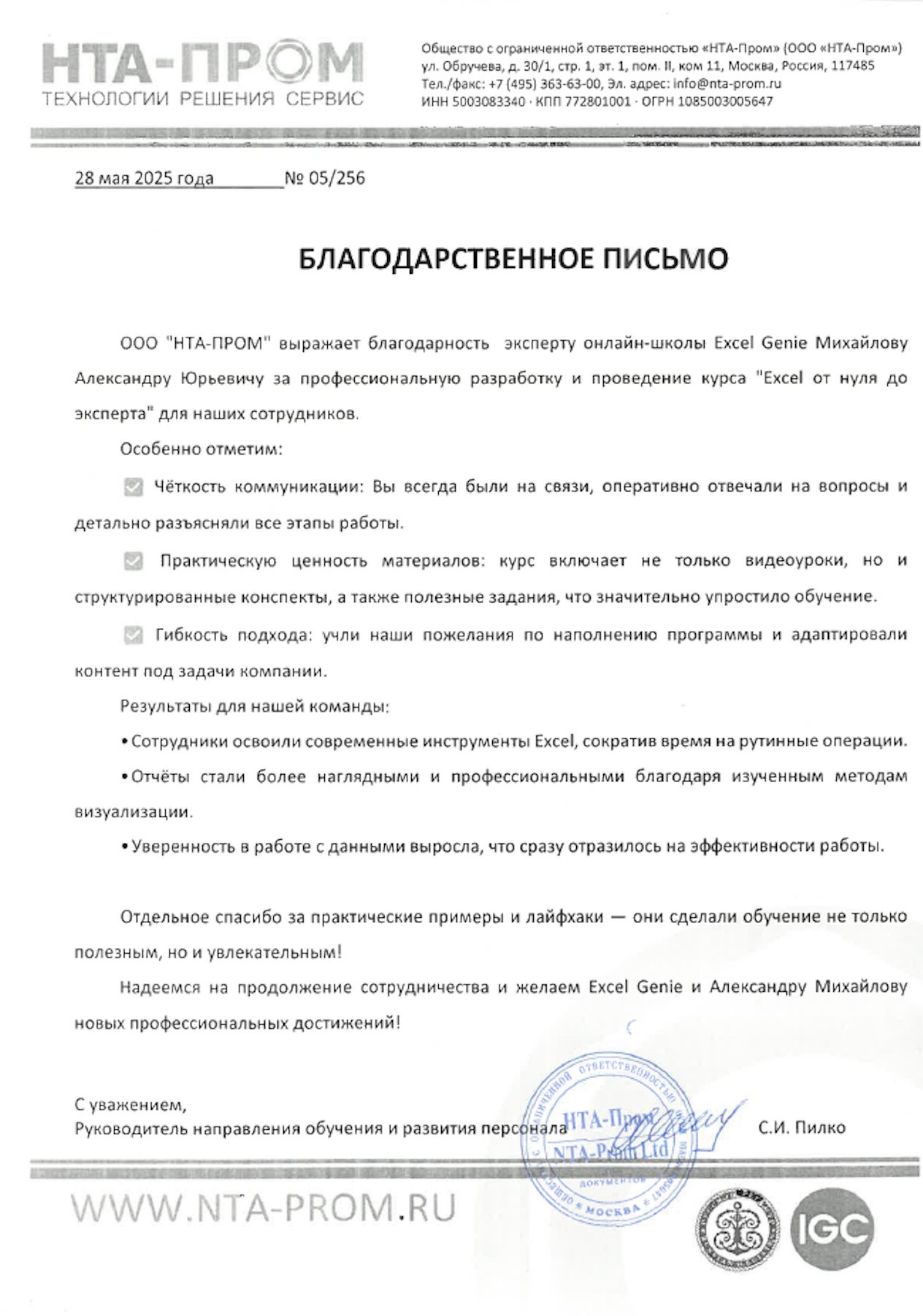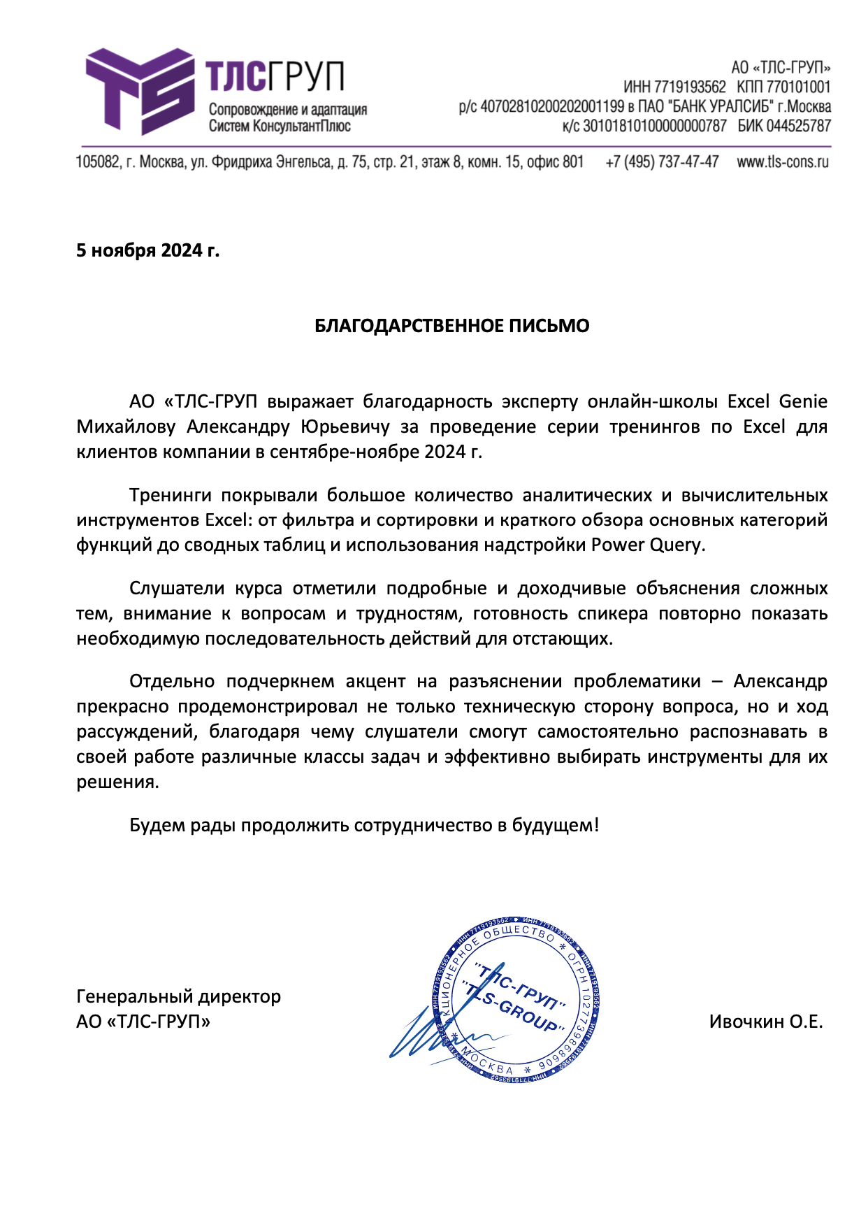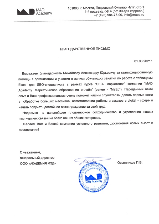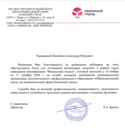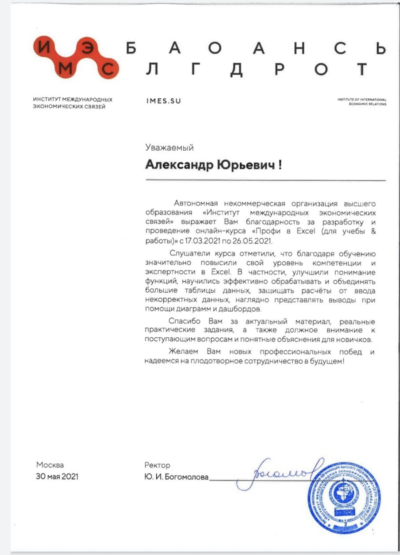 За время работы я получил множество благодарностей от компаний, где вел тренинги. Руководство и сотрудники отмечают высокий профессионализм, индивидуальный подход к участникам, а также значительное снижение трудозатрат на выполнение работ в Excel и экономию рабочего времени.