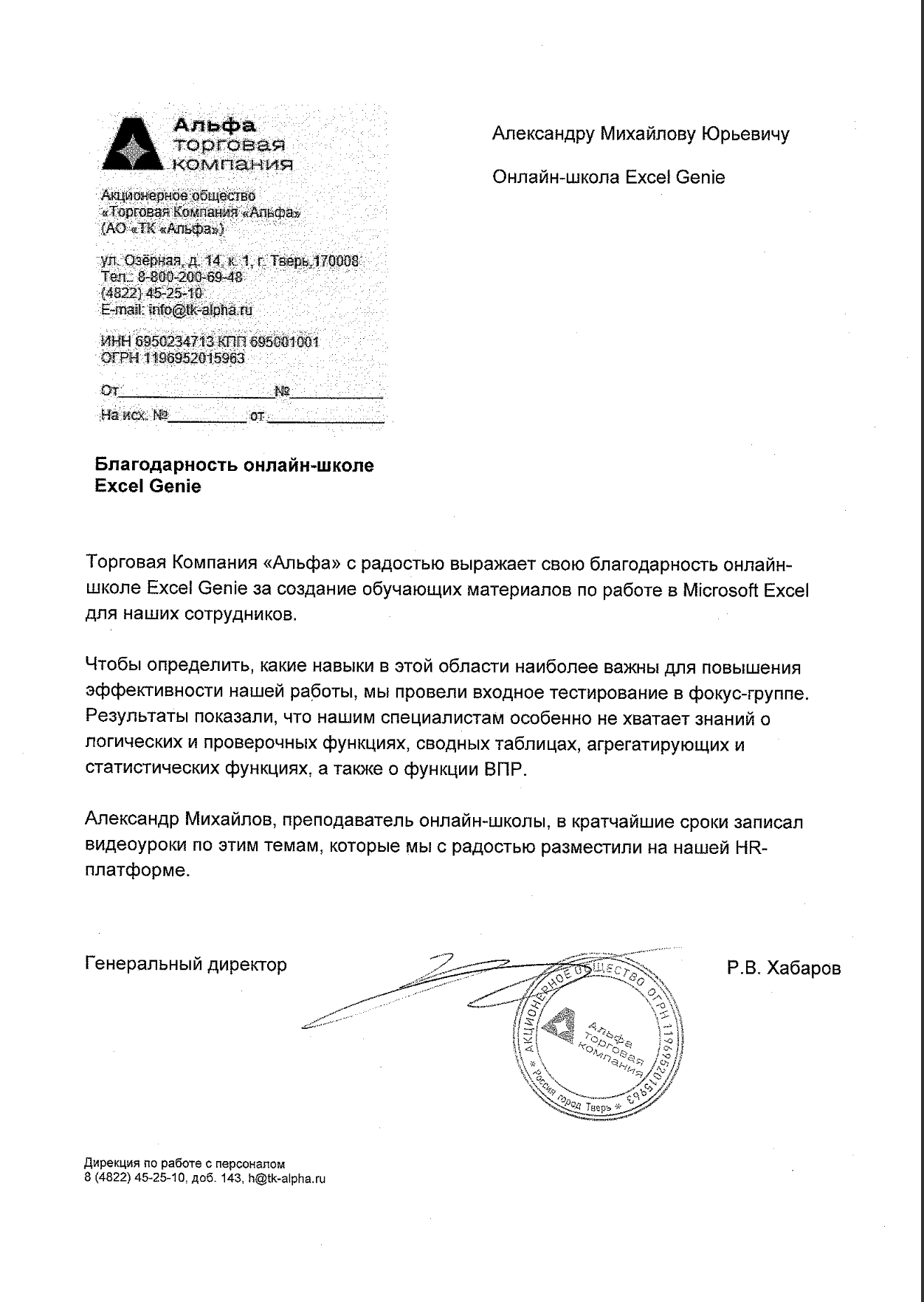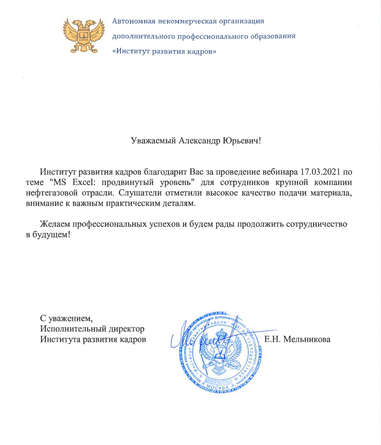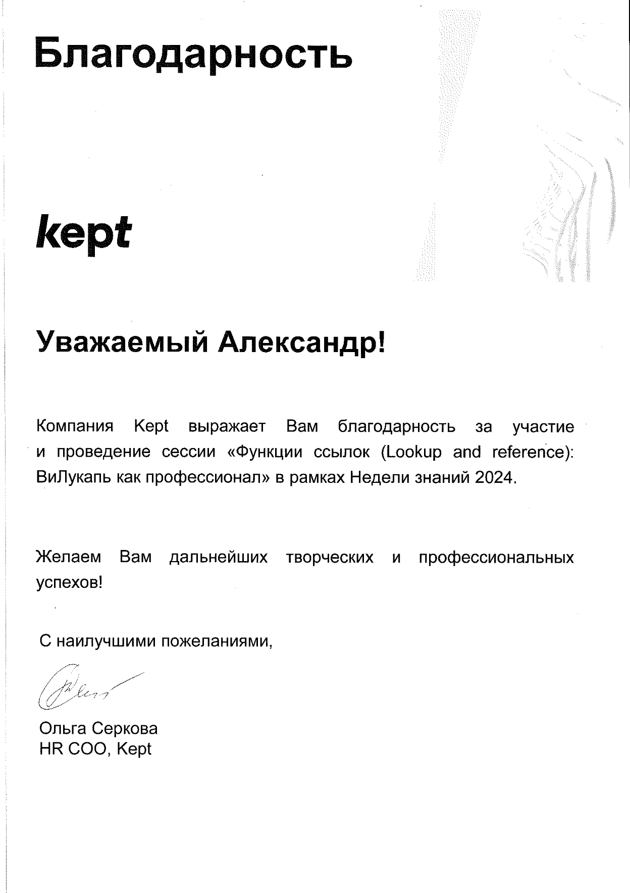 За время работы я получил множество благодарностей от компаний, где вел тренинги. Руководство и сотрудники отмечают высокий профессионализм, индивидуальный подход к участникам, а также значительное снижение трудозатрат на выполнение работ в Excel и экономию рабочего времени.